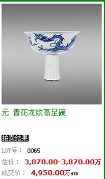 元 青花纏枝牡丹紋摩羯魚 3000-5000萬(wàn) 3622.5萬(wàn) 2016/5/22